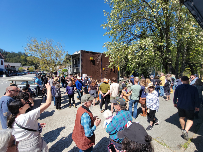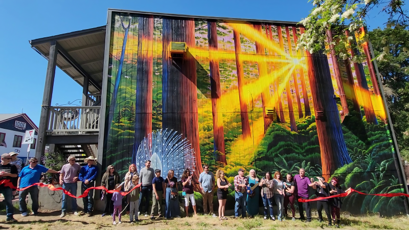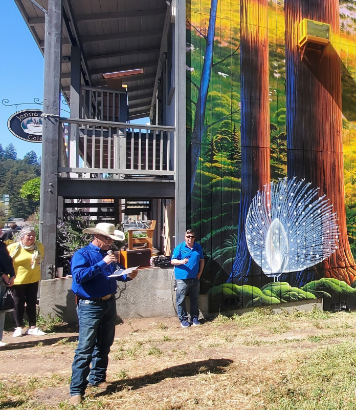 Albert the white peacock of Boulder Creek lives on in immortal memory! On Saturday, April 19, 2025, the community gathered in Boulder Creek to witness the unveiling of a massive mural painted on the side of the Forest Corners building by local artist Yeshe Jackson. Brought to fruition by the thoughtful actions of community member Kevin Foster and the Boulder Creek Business Association 2024 Board of Directors, supported by E. Clampus Vitus Branciforte Chapter 1797 and the San Lorenzo Valley Chamber of Commerce, along with residents of the town, the mural is a bright, positive statement in the heart of the downtown district symbolizing strength, resilience, and an unshakeable sense of togetherness.