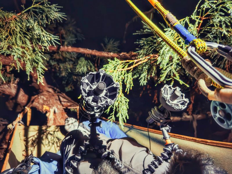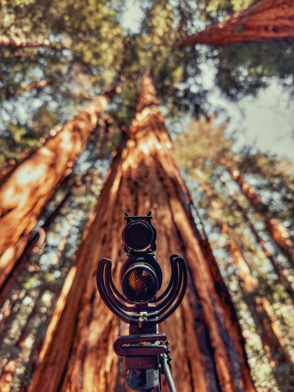 Beverly worked in the grove over two seasons, using a range of sensitive Sennheiser microphones to document the forest’s acoustics at multiple heights. His setup included a cluster of ultra-quiet condenser microphones designed for field recording – tools capable of picking up the faint tremor of wind inside the canopy or the first stirrings of dawn birdsong. One configuration, a double array using small-diaphragm mics, let him aim the microphones upward from the forest floor to catch the shifting murmur of needles tens of meters above him.