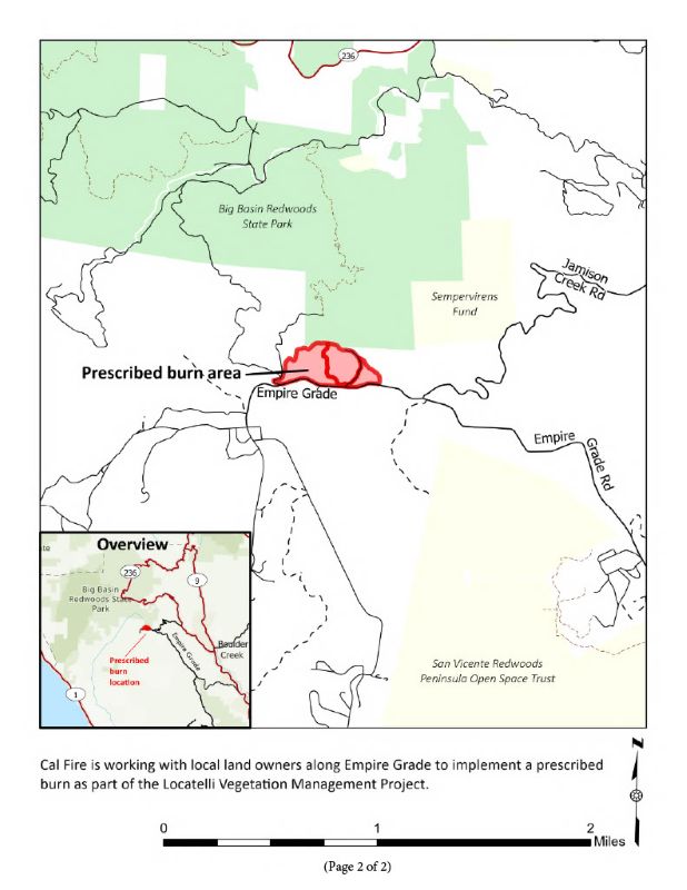 This controlled burn will create a strong firebreak, reduce flammable vegetation, and remove ladder fuels that allow fires to spread from the ground to the canopy. Smoke impact is expected to be minimal, though it may be visible from Boulder Creek over the ridge toward Empire Grade on the burn day.