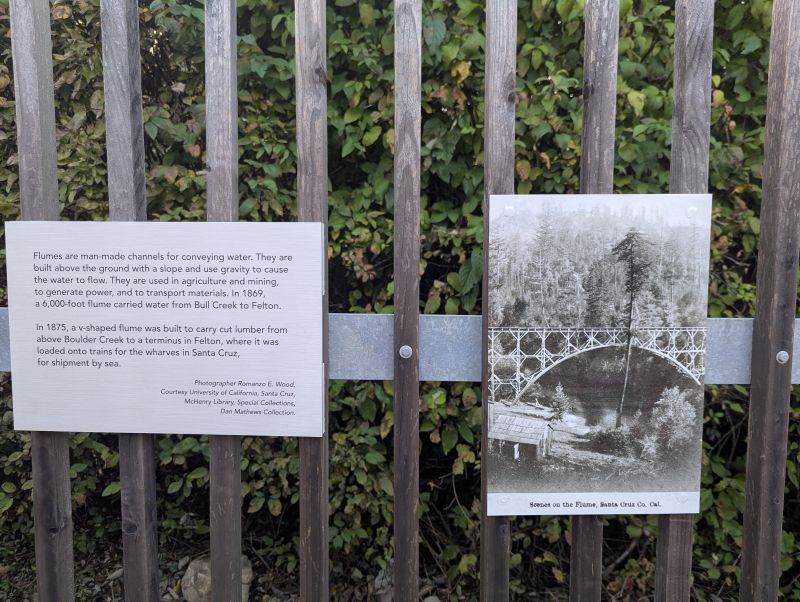 At the Felton Library, two new signs adorn the patio fence. They were designed and funded by Felton Library Friends to help explain the small flume replica’s reference to Felton’s history. Lisa Robinson of the SLV Museum obtained the photo of a local flume circa 1875 (by Romanzo.E. Wood, courtesy UCSC Special Collections, Dan Mathews collection). She also wrote the text for the sign about the uses of flumes that reads, “Flumes are man-made channels for conveying water. They are built above the ground with a slope and use gravity to cause the water to flow. They are used in agriculture and mining, to generate power, and to transport materials. In 1875, a v-shaped flume was built to carry cut lumber from above Boulder Creek to a terminus in Felton, where it was loaded onto trains for the wharves in Santa Cruz, for shipment by sea.”