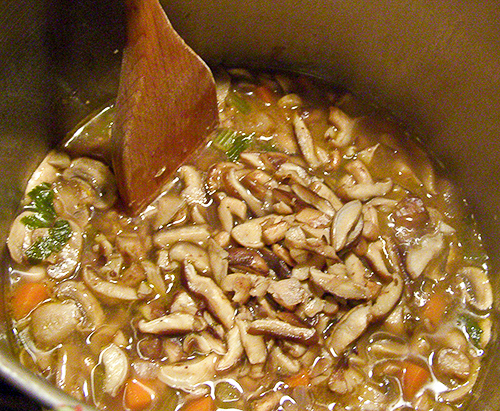 Originally the recipe called for only shiitake mushrooms. Because shiitakes are strongly flavored and expensive, I substituted half with button mushrooms. You could try crimini mushrooms if you like. Shiitakes have higher immune boosting properties than most ‘shrooms, so do include them in the mix. Don’t skip the step of frying up the mushrooms in two batches and deglazing the pan, then adding both to the pot. The broth won’t be thick and delicious if you just throw the mushrooms in with the other veggies.