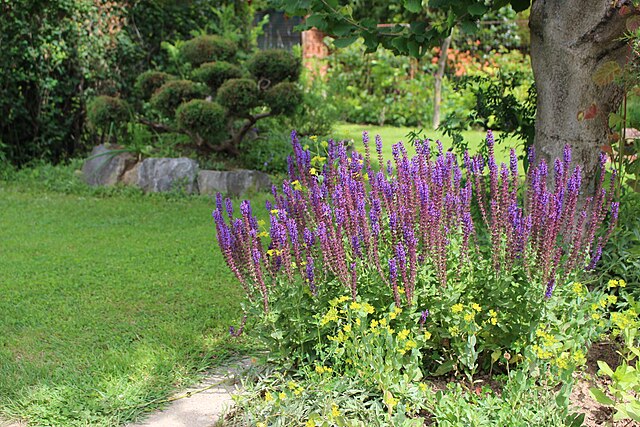 Multiple cultivars of Woodland sage, Salvia nemerosa, are blossoming heavily now in various shades of purple, fuchsia and maroon. These are of little interest to deer but are candy, alas, for gophers. Salvia “Mystic Spires” and the taller “Indigo Spires” are in full bloom in June, but are equally appealing to gophers. Visit your local garden supplier for natives, such as, Salvia “Pozo Blue” (S. clevelandii x leucophylla), with upright flower shoots, ringed with dark, rich blue blossoms or Salvia “Bee’s Bliss,” with a lighter lavender-blue blossom atop sprawling light grey foliage. All these plants are great for native bees. California has about 1600 species, many found in the greater San Francisco Bay area. Make a home for these industrious and absolutely vital creatures if you can. Native bees only sting under severe, life-or-death distress. If one alights upon your hand, just gently raise your arm. The bee will reorient itself with the sun and fly away. You are not a source of pollen and are therefore of no interest to bees.