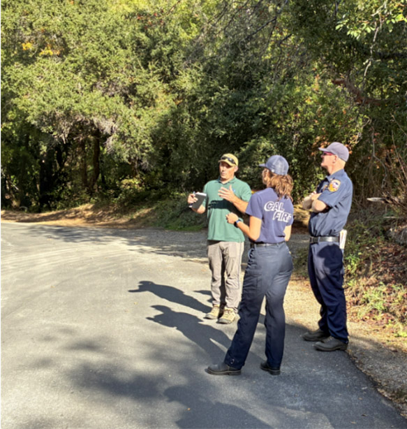 The Miller Property County Park Shaded Fuel Break Project is a collaborative effort between Santa Cruz County Parks and CAL FIRE to reduce wildfire risk, strengthen community resilience, and improve forest health along Kings Creek Road in Boulder Creek. A shaded fuel break is a strategically treated strip of forest designed to slow the spread and intensity of wildfire — not by clearcutting, but by carefully modifying the forest structure. In a shaded fuel break, crews selectively thin out smaller-diameter trees, remove dense brush and “ladder fuels” that can carry fire from the forest floor into the canopy, and prune the lower limbs of larger, healthy trees. By retaining the mature overstory canopy, shaded fuel breaks maintain soil moisture, reduce wind speeds at ground level, and support wildlife habitat while making the forest far less conducive to fast-moving, high-intensity fire.