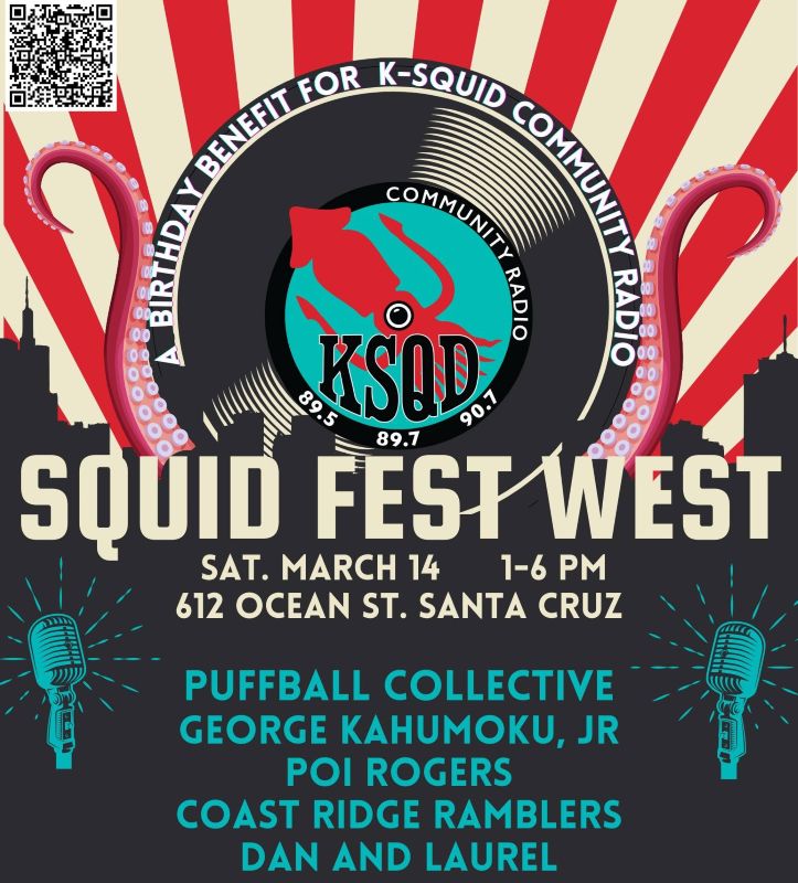 ๐ถ Squid Fest West KSQD Benefit – The Puffball Collective + George Kahumoku Jr. + Poi Rogers + Coast Ridge Ramblers + Dan & Laurel | Resource Center for Nonviolence | Sat Mar 14 | 1:00-6:00 | Santa Cruz