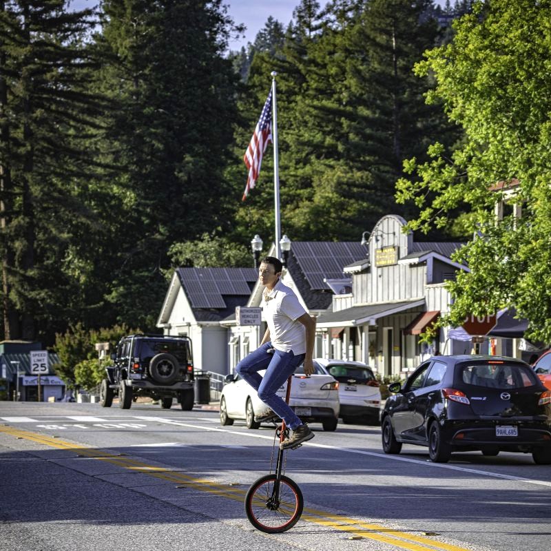 Photo: A unicycler enjoys a ride on Highway 9 in Boulder Creek, perhaps in anticipation of the town’s annual 4th of July parade. (SLV Steve)