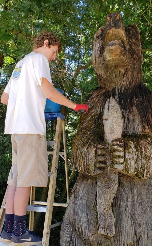 In preparing for the project, Neal researched the best eco-friendly way to clean, stain, and seal the bear. Advisors included members of the California Parks Maintenance Department, who are familiar with outdoor durability challenges. With donations of supplies from local sources like Scarborough Lumber Ace Hardware, Central Home Supply in Scotts Valley, and Boulder Creek Pizza, Neal put together a volunteer team of fellow Scouts to focus on individual parts of the work plan.